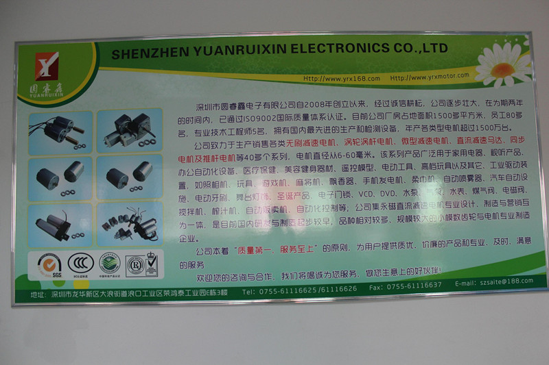 深圳市圓睿鑫電子有限公司自2008年創(chuàng)立以來,經(jīng)過誠信耕耘,在為期兩年的時間內(nèi),已通過ISO9001:2000國際質(zhì)量體系認(rèn)證。公司廠房占地面積2000多平方米,員工100人,專業(yè)技術(shù)工程師6名,擁有國內(nèi)最先進(jìn)的生產(chǎn)和檢測設(shè)備,年產(chǎn)各類減速電機超過2~300萬臺。因公司發(fā)展需要,于2020年底,將生產(chǎn)基地遷往擁有最美小鎮(zhèn)之稱的東莞市清溪鎮(zhèn),依山傍水,依托美麗的大自然環(huán)境和地方文化,全新的東莞市圓睿鑫電子有限公司將借助深圳母公司平臺,一步步走上新的臺階。